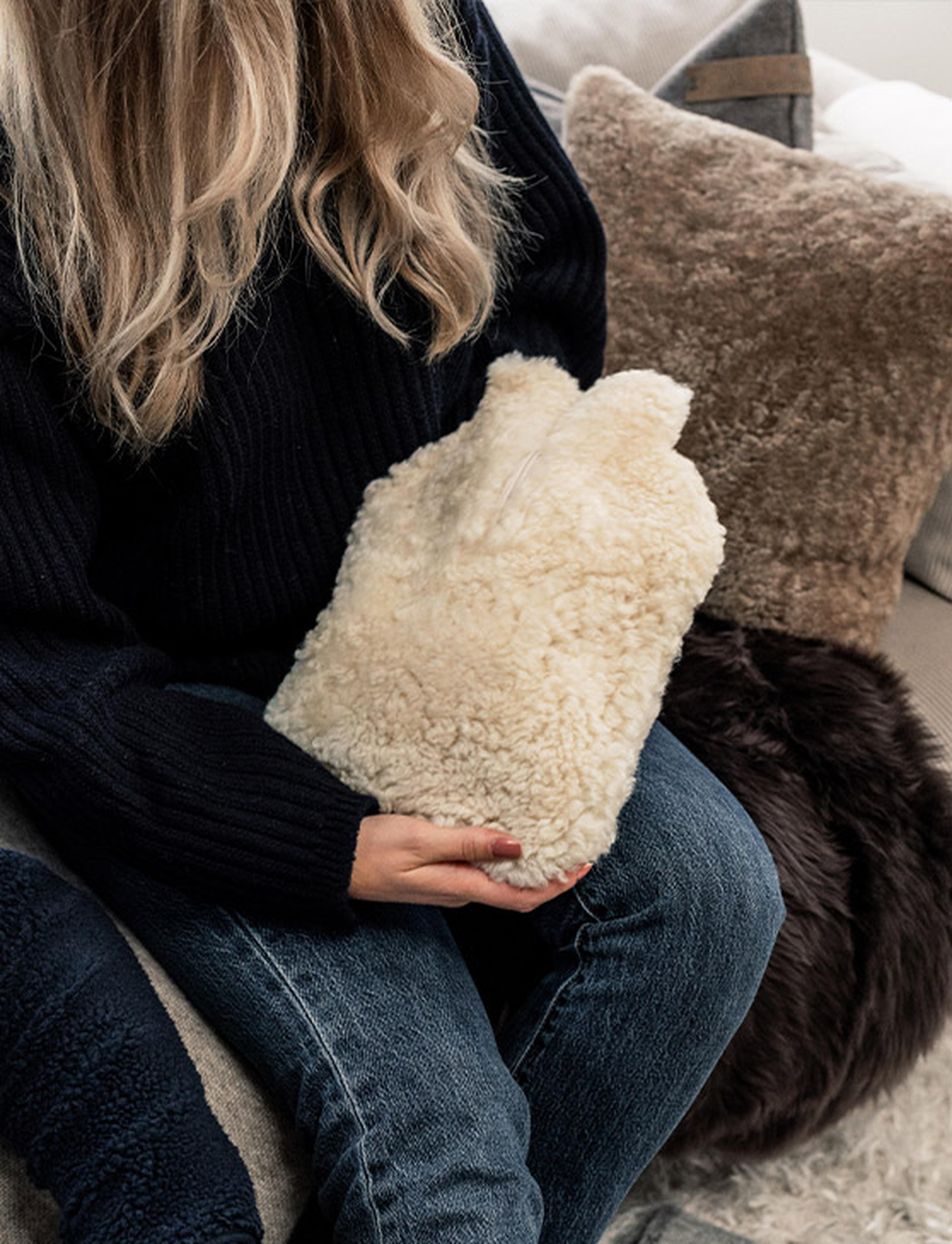 Schaffell-Wärmflaschenbezug bietet ein angenehmes und weiches Gefühl, wenn man friert. Die Nutzung einer Wärmflasche zur Wärme kann bestimmte Beschwerden wie kalte Füße, Muskel- und Gelenkschmerzen, Bauchschmerzen, Menstruationsbeschwerden, Rücken- und Nackenverspannungen lindern. Sie kann auch verwendet werden, um kalte Betten aufzuwärmen.