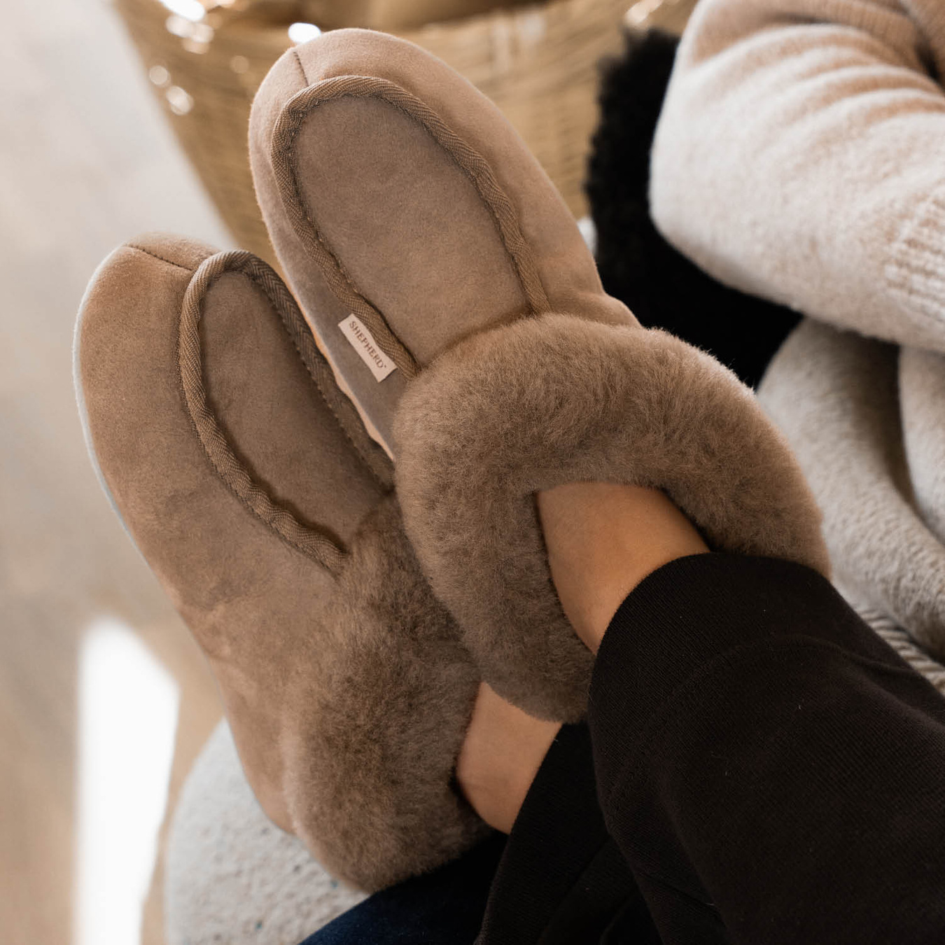 Shepherd Moa ist ein knöchelhoher Hausschuh mit einem breiten, flauschigen Lammfellbund,  der den Fuß in sanfte Wärme hüllt, während Textilbänder einen klassischen Akzent hinzufügen.