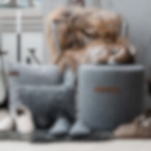 Shepherd Sara a pouf made from weaved wool. The pouf is built up of a sturdy bottom which makes the pouf hold it’s form. The top is made from foam for comfort. The sheepskin covering is removable and washable with a drawstring on the bottom. The underneath is made from weaved fabric. 40x40cm