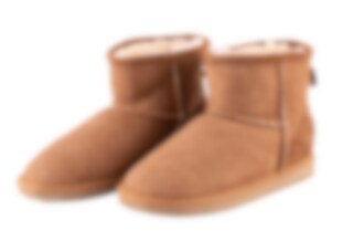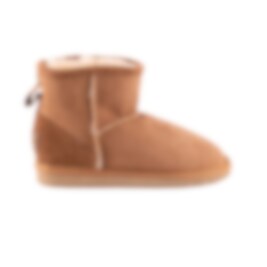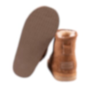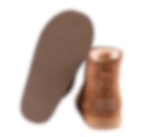 Shepherd Mora is a pair of comfortable and warm sheepskin ankle-high boots for children. The boots have decorative surface stitching and binding in the fabric around the sole and shaft. There is a tag at the back. The outer sole is 1cm thick and made of EVA.
