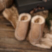 Shepherd Bea is a low-ankle slipper in soft sheepskin that gently wraps the foot in warmth. The open heel makes them easy to slip on and off, while the decorative exposed seams enhance the handmade expression.