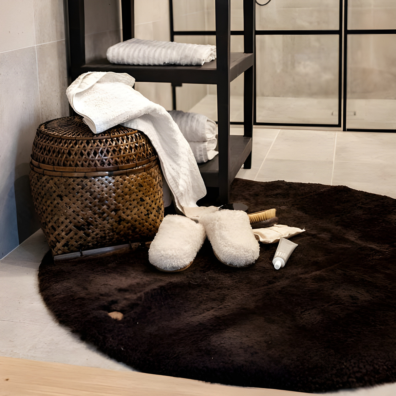 Shepherd Ebba. Et rundt og blødt tæppe i korthåret fåreskind med australsk oprindelse. Alle fåreskind er naturlige og kan derfor variere i deres naturlige struktur. Bagside i ufarvet læder.