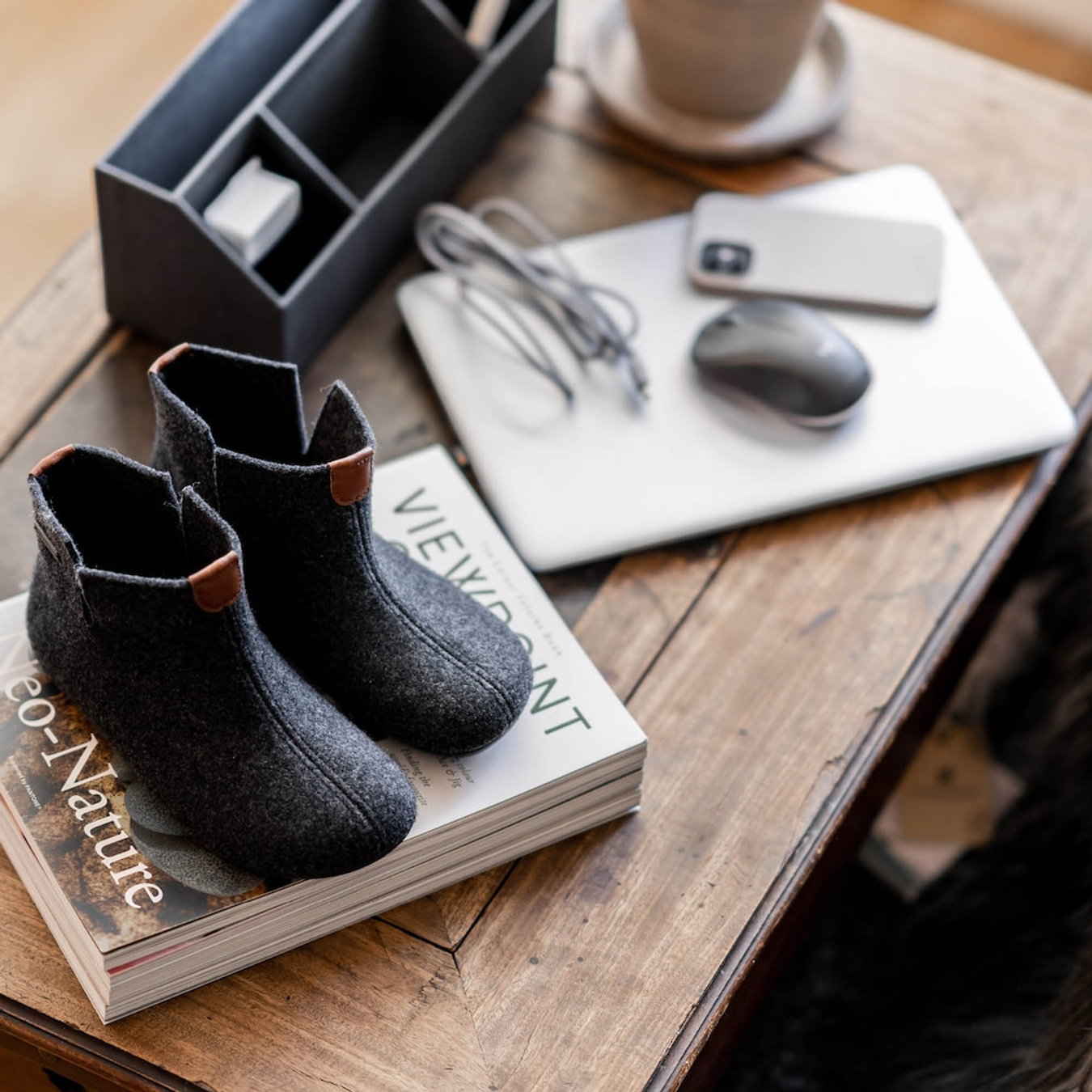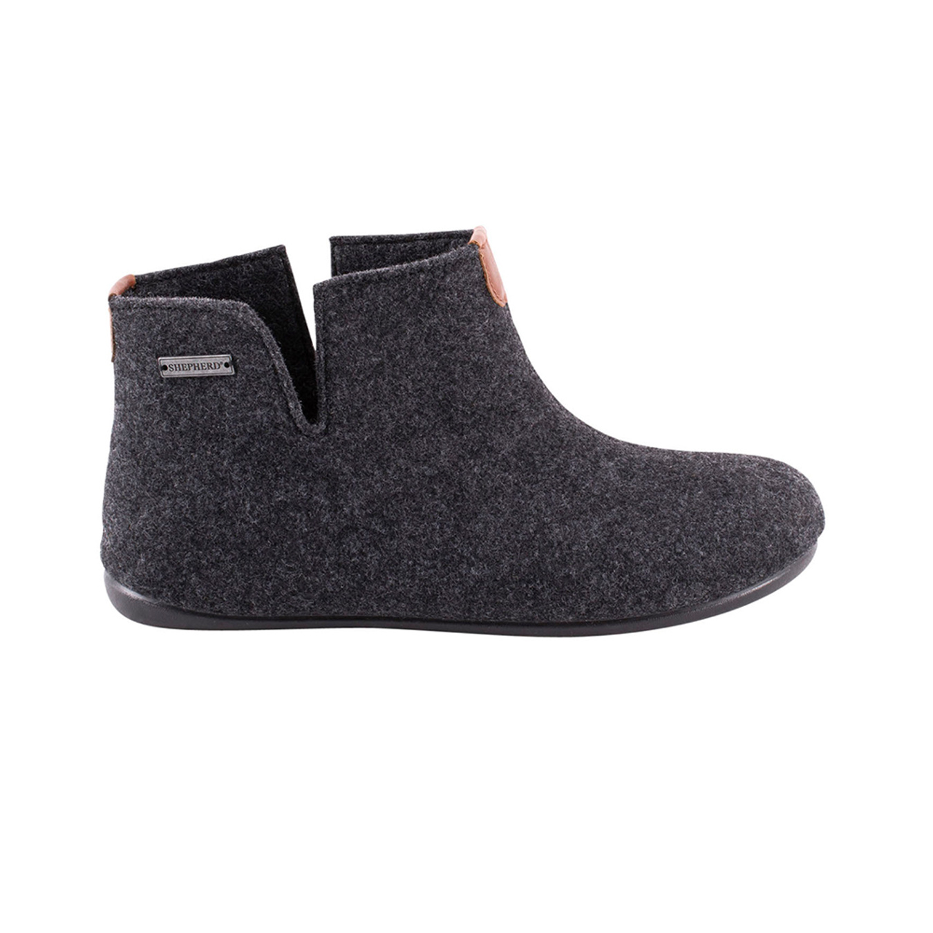 Shepherd Erik er en ankelhøj uldtøffel med en solid fornemmelse og en pasform, der sidder behageligt omkring foden. Ulden varmer naturligt uden at føles indelukket, og de diskrete slidser i siderne gør dem nemme at få på. Den synlige syning foran og læderdetaljer giver et robust, men stilrent udtryk.