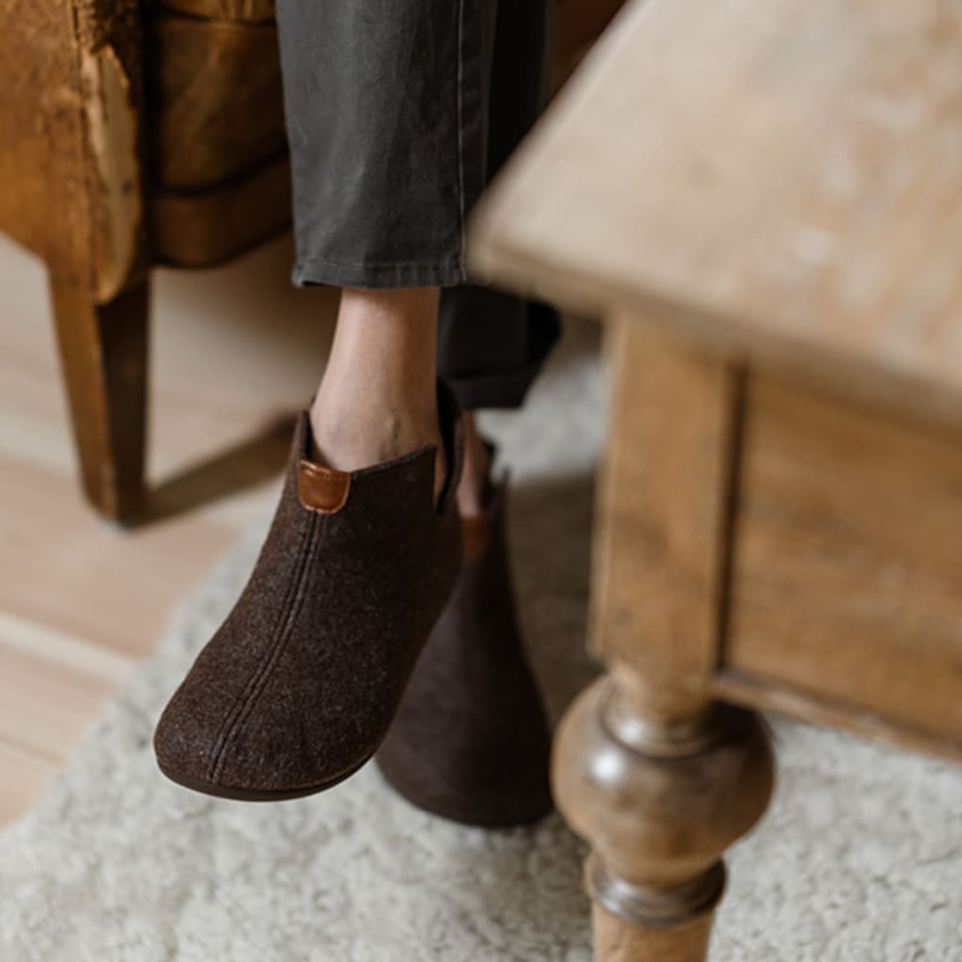Shepherd Erik er en ankelhøj uldtøffel med en solid fornemmelse og en pasform, der sidder behageligt omkring foden. Ulden varmer naturligt uden at føles indelukket, og de diskrete slidser i siderne gør dem nemme at få på. Den synlige syning foran og læderdetaljer giver et robust, men stilrent udtryk.
