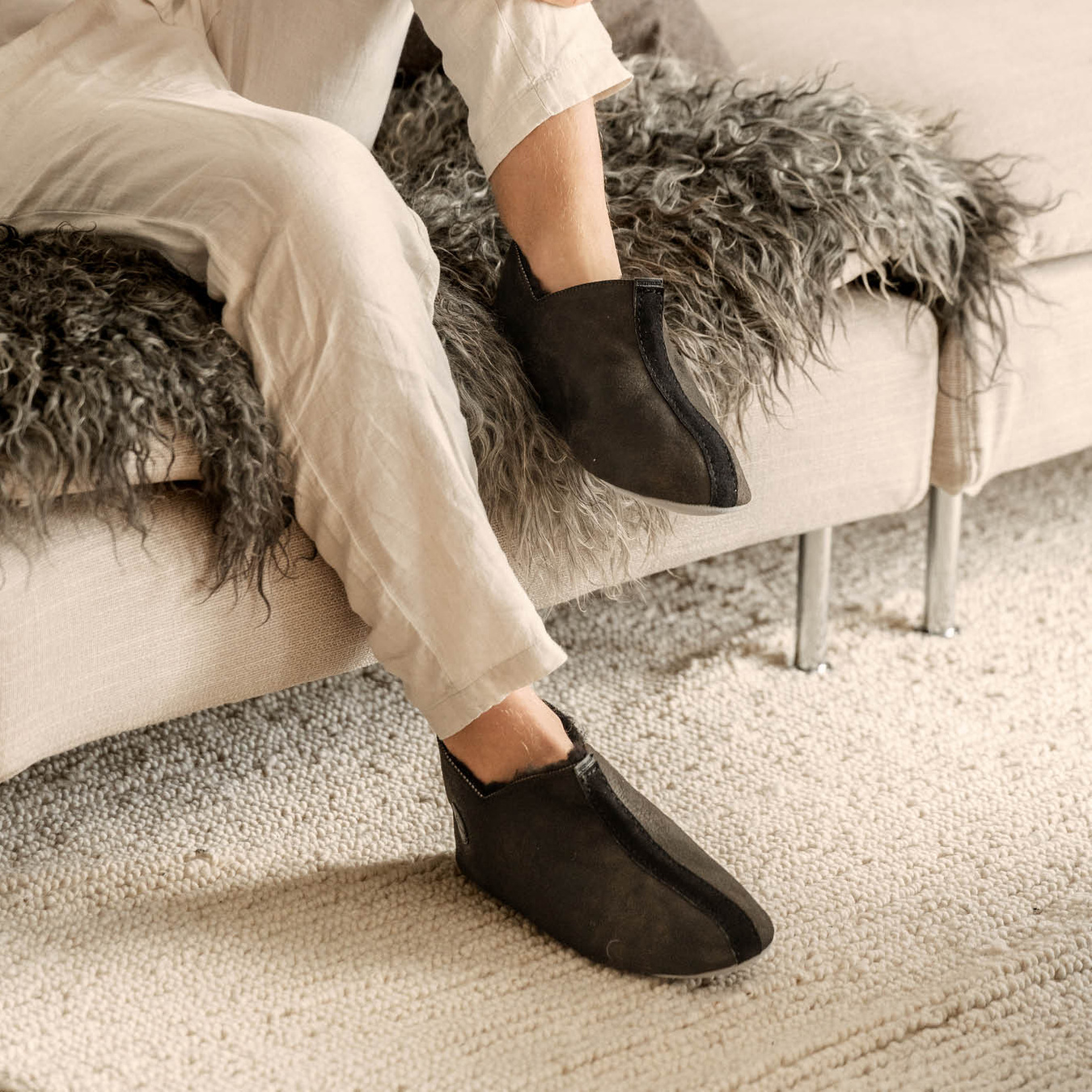 Med den fleksible ruskindssål er modellen perfekt til afslapning i sofaen, mens det naturligt varmende for sikrer, at fødderne holder sig varme hele dagen. Et afslappet valg til dig, der vil have noget behageligt at vende tilbage til – morgen, aften og weekend.