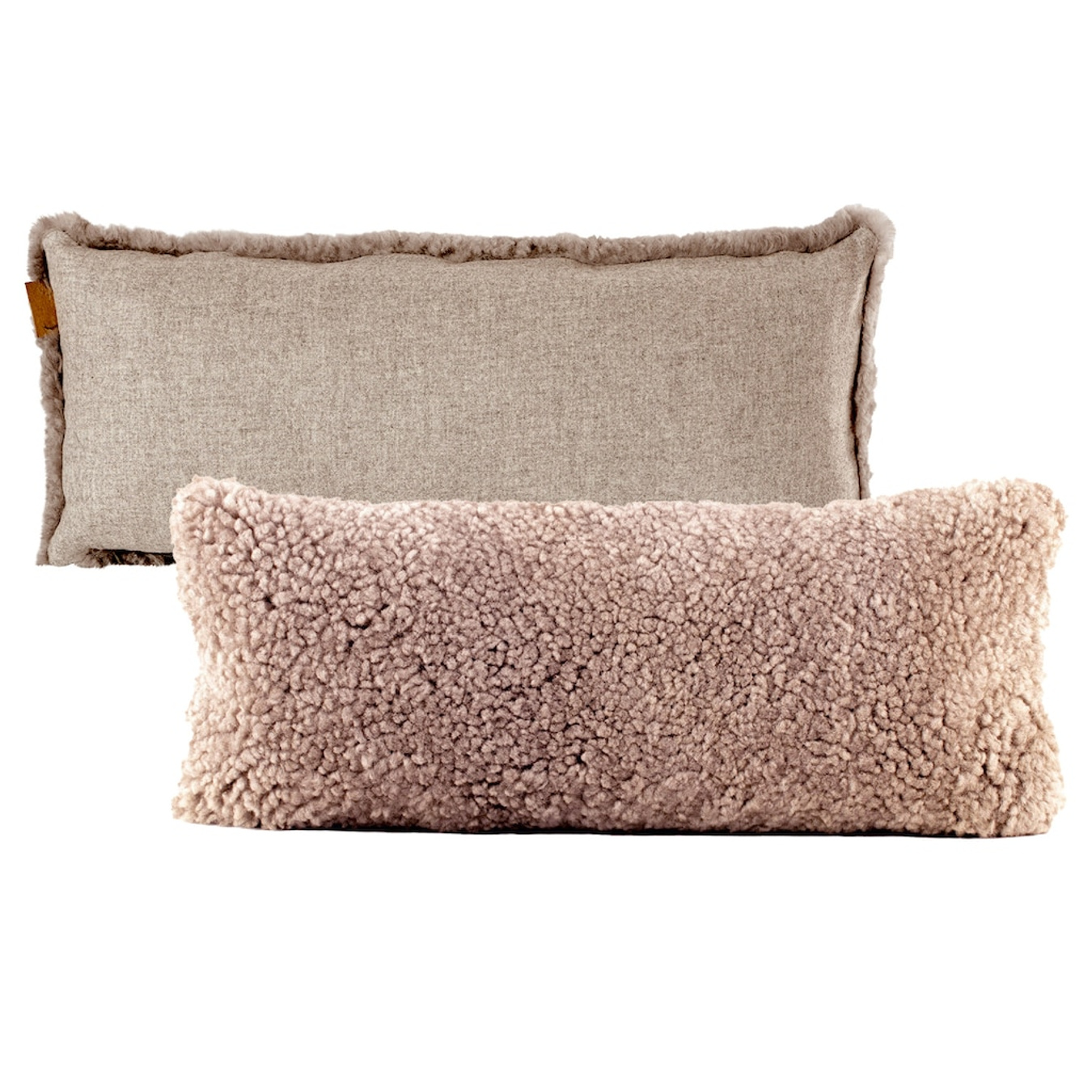 Shepherd Lina. En pude med forside i korthåret, blødt fåreskind med australsk oprindelse og bagside i vævet uld. Skjult lynlås. Inderpude i polyesterblanding med fyld af 50 % siliconeskruer og 50 % andefjer, hvilket gør, at puden føles luftig og holder sin form. Alle fåreskind er naturlige og kan derfor variere i deres naturlige struktur. 60x25cm