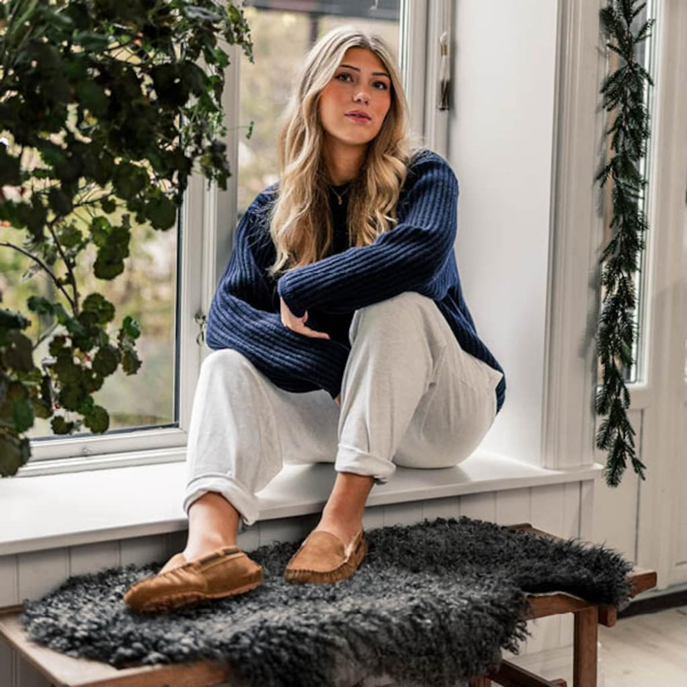 Shepherd Mirre er et par bløde og varme tøfler i ruskind, foret med ægte fåreskind for en omsluttende komfort. Den klassiske mokkasinmodel har et subtilt sejlerinspireret design med et smalt læderbånd, der løber hele vejen rundt om skoen.