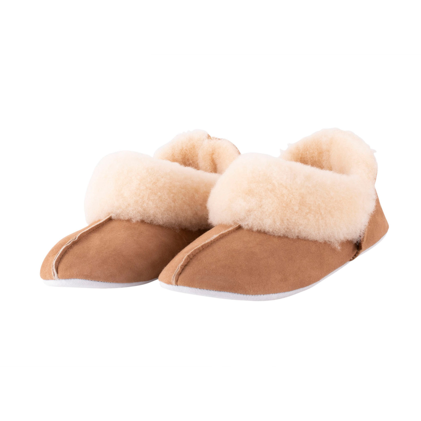 Den brede, bløde fåreskindskrave foran indrammer foden på en indbydende måde, mens den lige hælkappe giver en stilren silhuet. De dekorative udvendige sømme leder tankerne hen på ægte håndværk, og den bløde ruskindssål giver et naturligt greb mod gulvet.