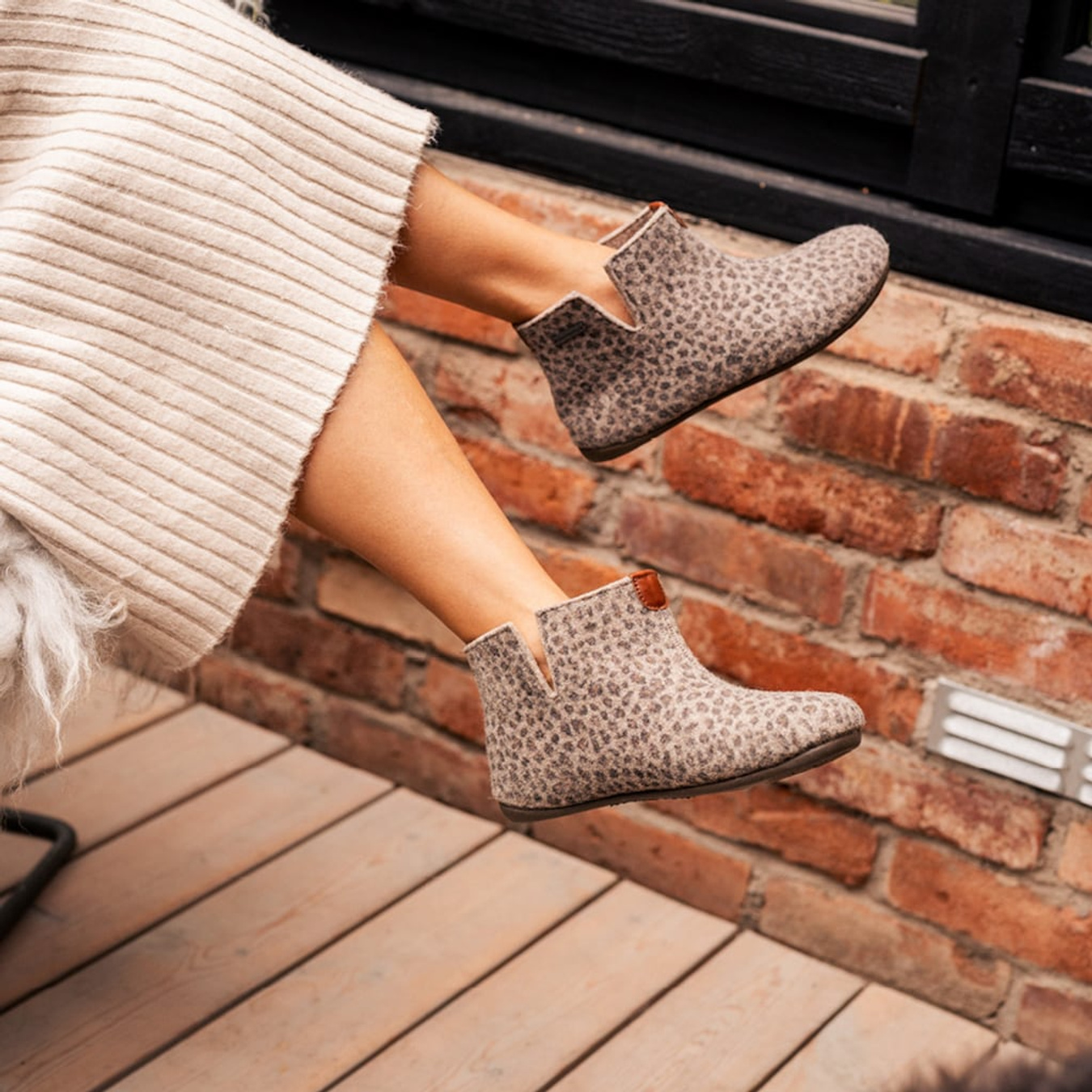Shepherd Ester is an ankle-high wool slipper for women, perfect as an indoor shoe for everyday chores. It has side slits for easy on and off, a soft wool insole, and a durable rubber sole. Leather details and a visible seam in front give it a timeless design. A comfortable and sleek slipper for active moments at home.