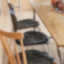 Shepherd Ida. Coussin de chaise rond non-rembourré. Fabriqué en peau de mouton à poils courts, d'origine australienne. Comme toutes les peaux de mouton sont naturelles, des variations sont possibles dans leur structure naturelle. La face inférieure est du cuir naturel. ø36 cm