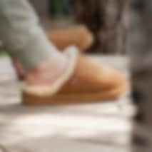 Shepherd Broo is a pair of warm sheepskin slippers for kids. The slippers are a classic slip-on design with slits at the sides making them easy to put on and take off. They have decorative surface stitching. The slippers have fabric binding around the sole. The outer sole is made with EVA.