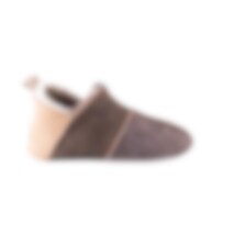 Shepherd Nol. Lämpimät ja ihanat lasten patchwork-tossut. Tossut ovat nilkkakorkuiset ja slip-in-malliset, mikä helpottaa niiden pukemista ja riisumista. Takana luonnonvärinen juuttikankaasta valmistettu lenkki, jossa tekstipainatus. Pehmeä mokkanahkapohja.