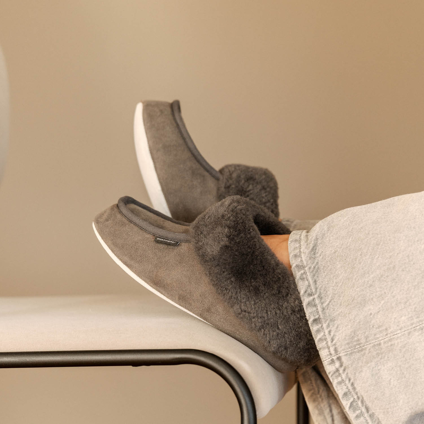 Shepherd Moa. Alkuperäiset tossut, jotka sopivat täydellisesti mukaviin hetkiin kotona. Nilkkakorkuisen mallin leveä ja pörröinen lampaannahkakaulus sulkee jalat pehmeän lämpimästi sisäänsä, ja koristeelliset tekstiiliset reunanauhat antavat klassisen vivahteen.