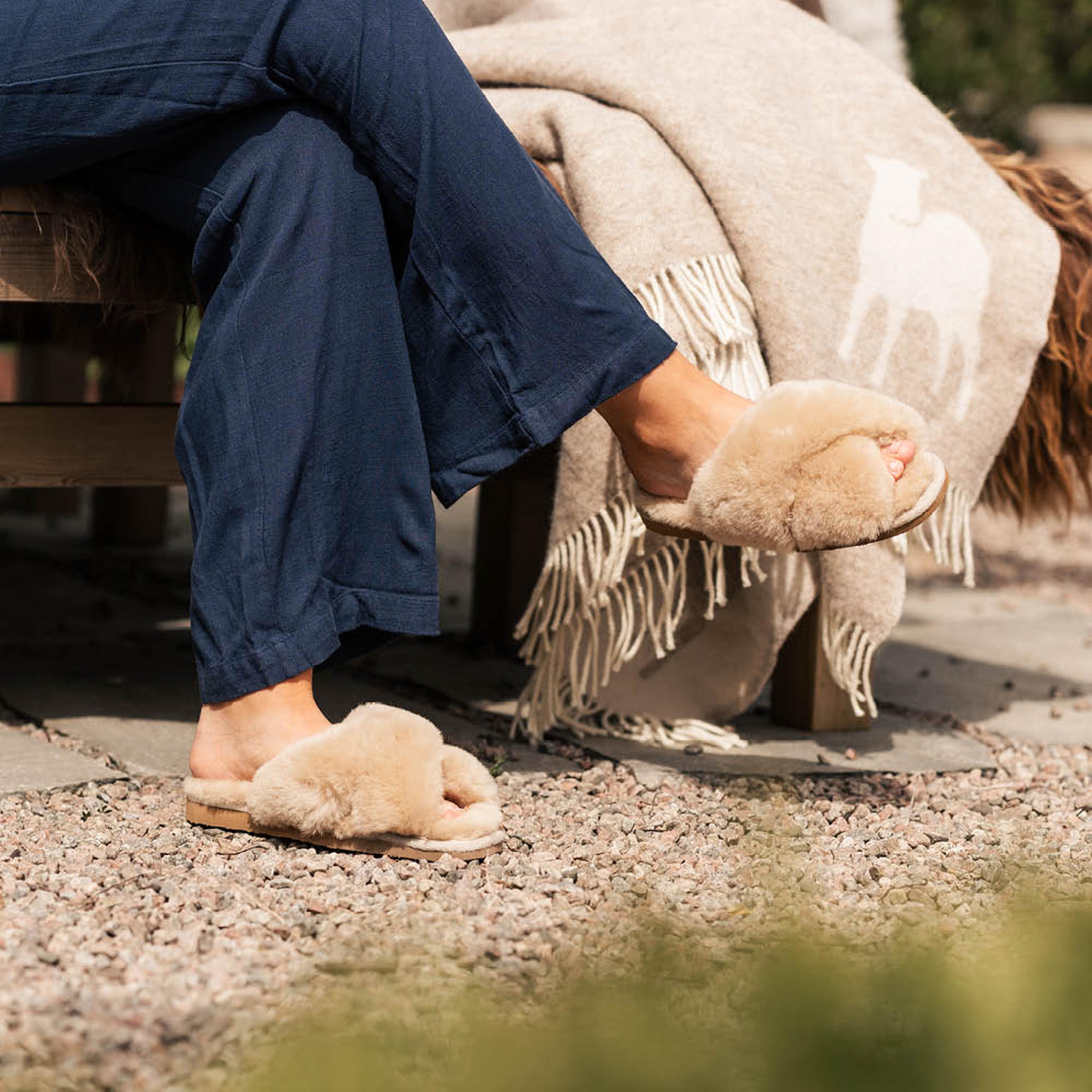 When she travels, the choice is obvious: Cleo. A pair of slim sheepskin slippers that easily fit in a bag but make a big difference when you want to feel at home – even in a hotel.