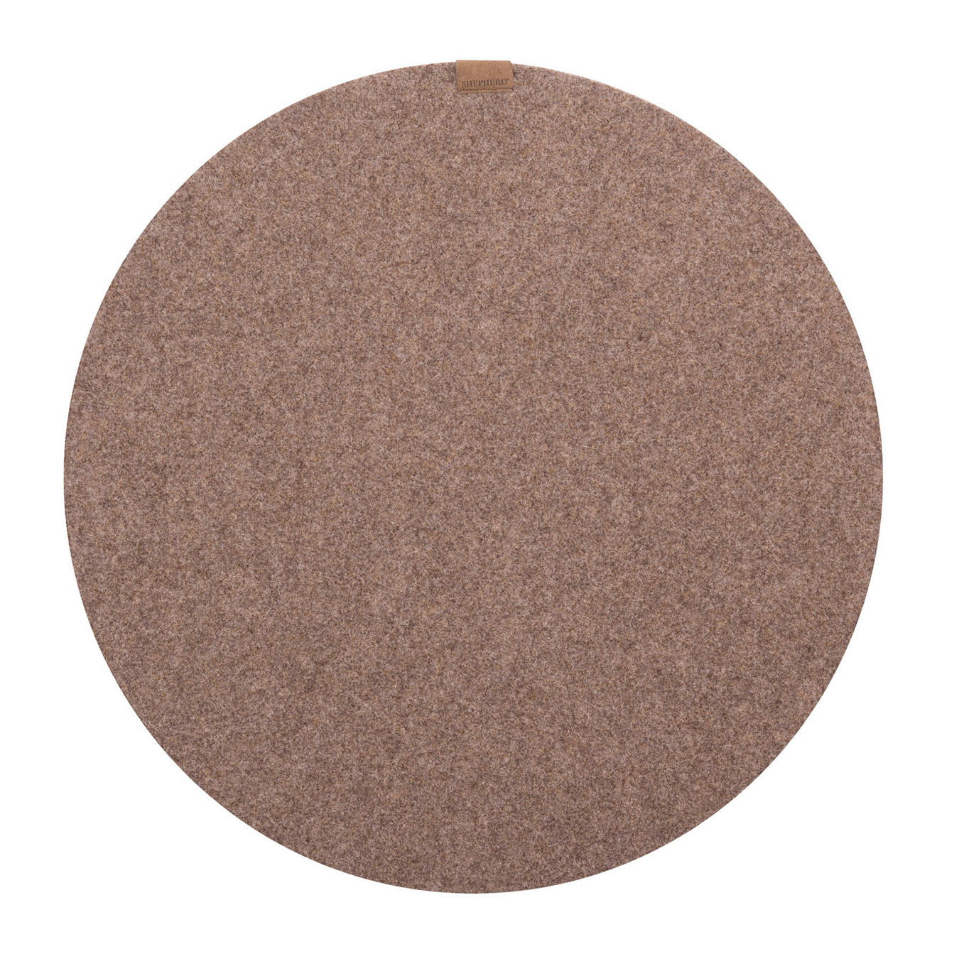 Shepherd Vilma. Rund bordbrikke i tovet ull. Brikken kan også gjerne brukes som gryteunderlag eller stolpute. Dekorativ detalj i imitert lær. Diameter 36 cm.