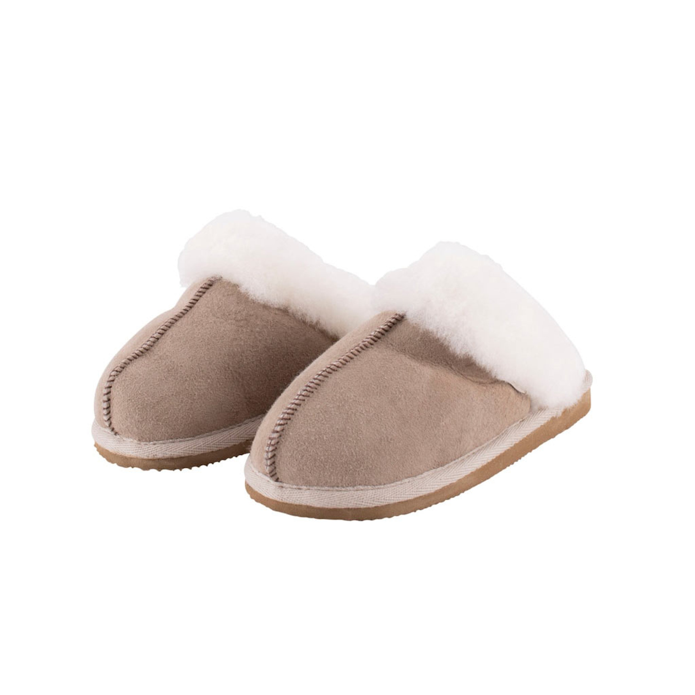 Shepherd Åre. Slip-in sheepskin slippers for children. The slippers have a decorative surface at the front and a wide sheepskin rim. The slippers have fabric binding around the sole. The sole is made of EVA.
