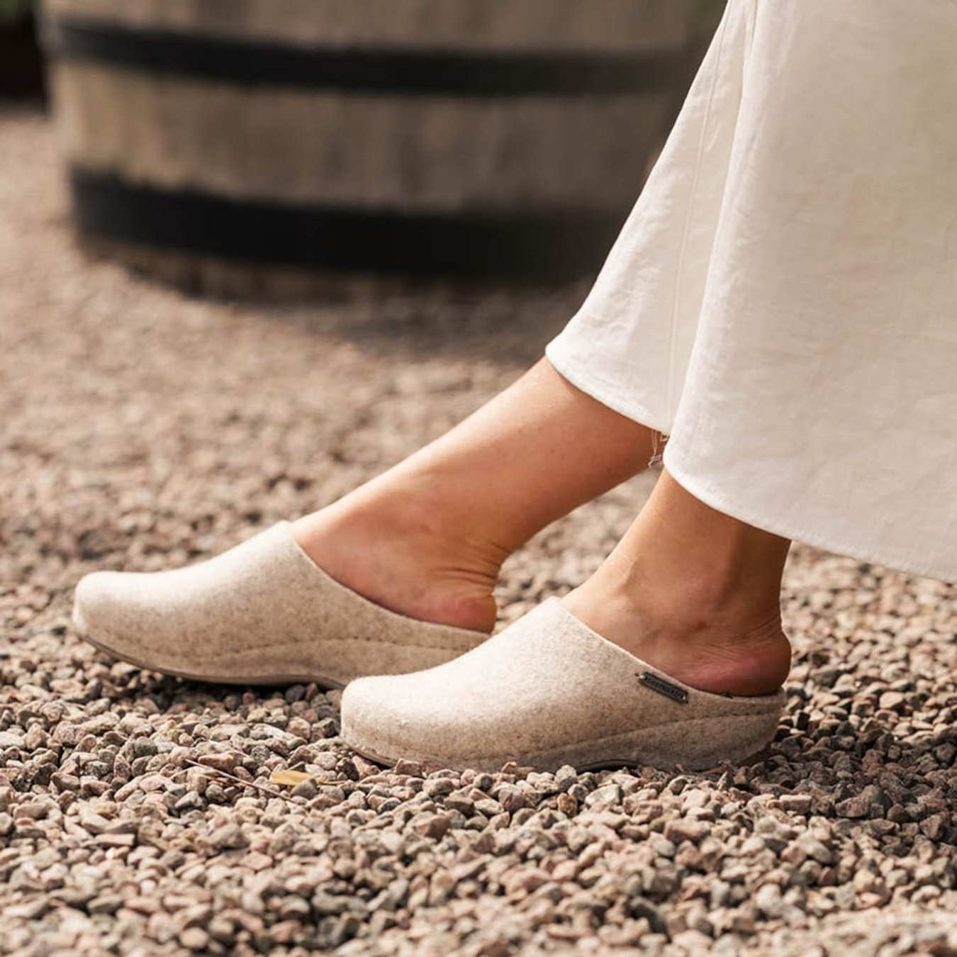 Shepherd Gitte is a pair of soft indoor shoes in felted wool, designed with care for those who need extra support and relief in daily life. The suede insole has a firm, anatomical shape that offers comfortable cushioning and follows the foot’s natural form, with arch support and a slight cupping to stabilize the heel.