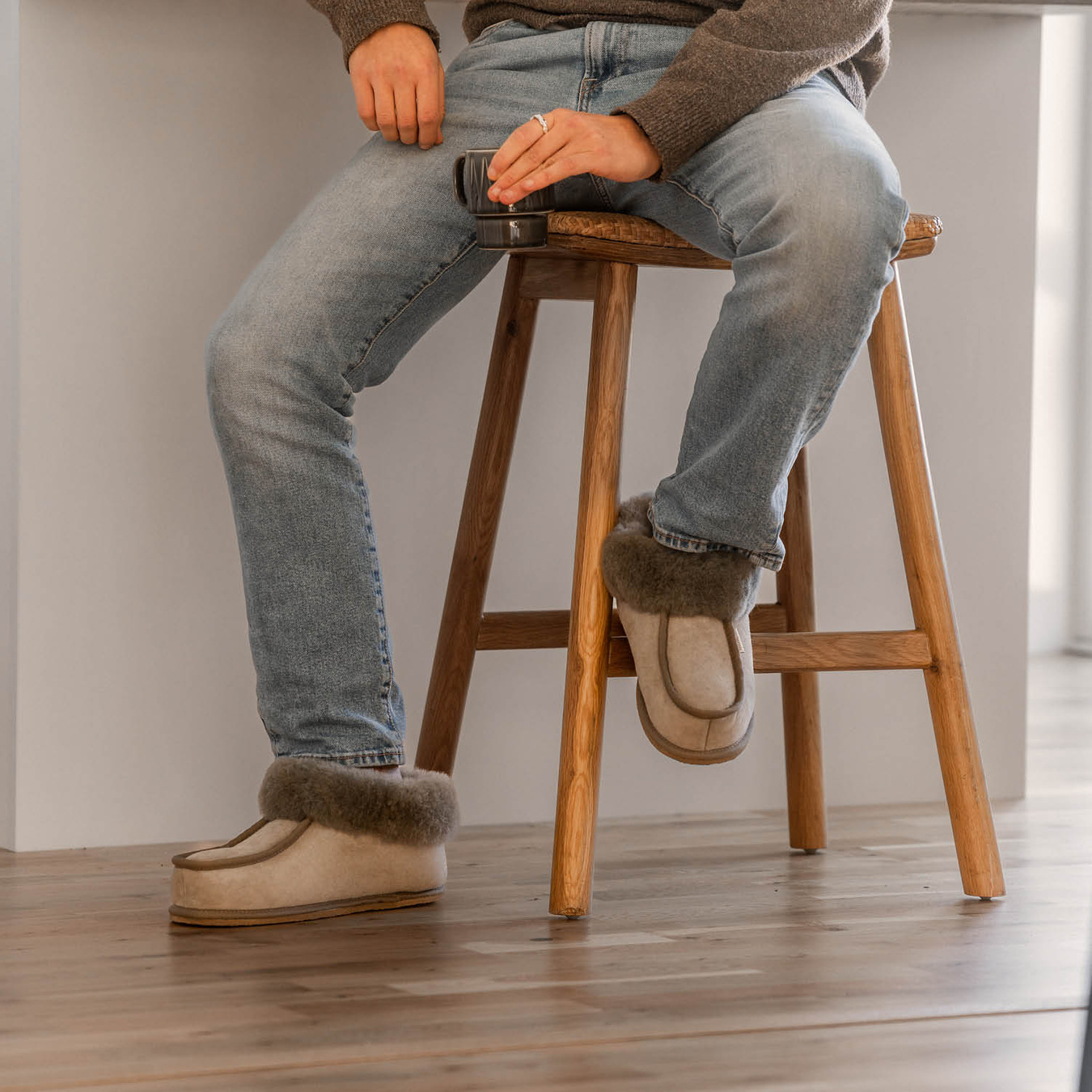 Shepherd Krister is a classic men’s slipper in an ankle-high design, crafted from soft sheepskin that provides natural warmth and a comfortable fit. The wide collar follows the ankle naturally for a relaxed feel, while textile trims frame the design.