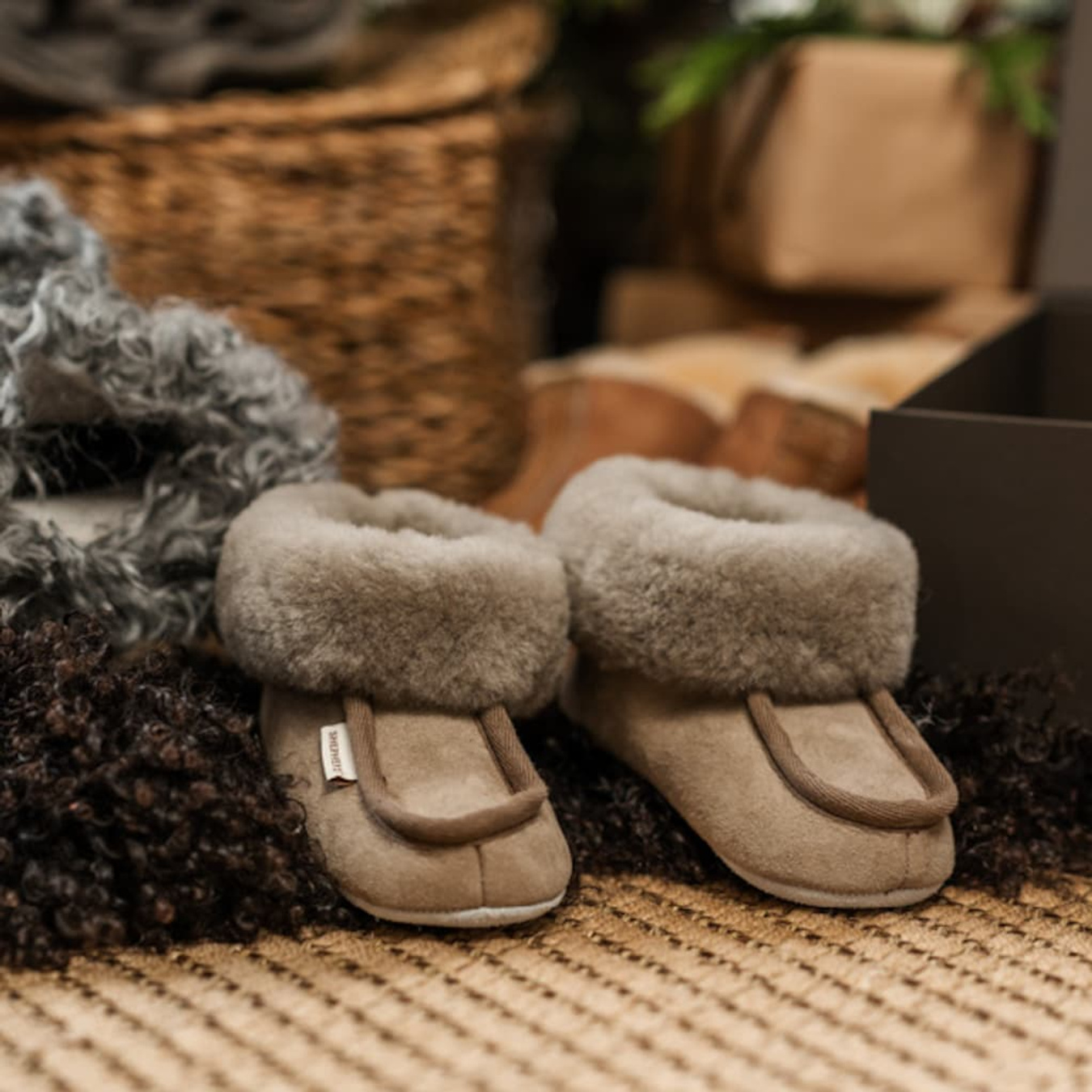 Shepherd Osby is a pair of warm and soft ankle-high sheepskin slippers for children. The slippers have a wide sheepskin rim and decorative fabric binding at the front. The soles are made of soft suede.