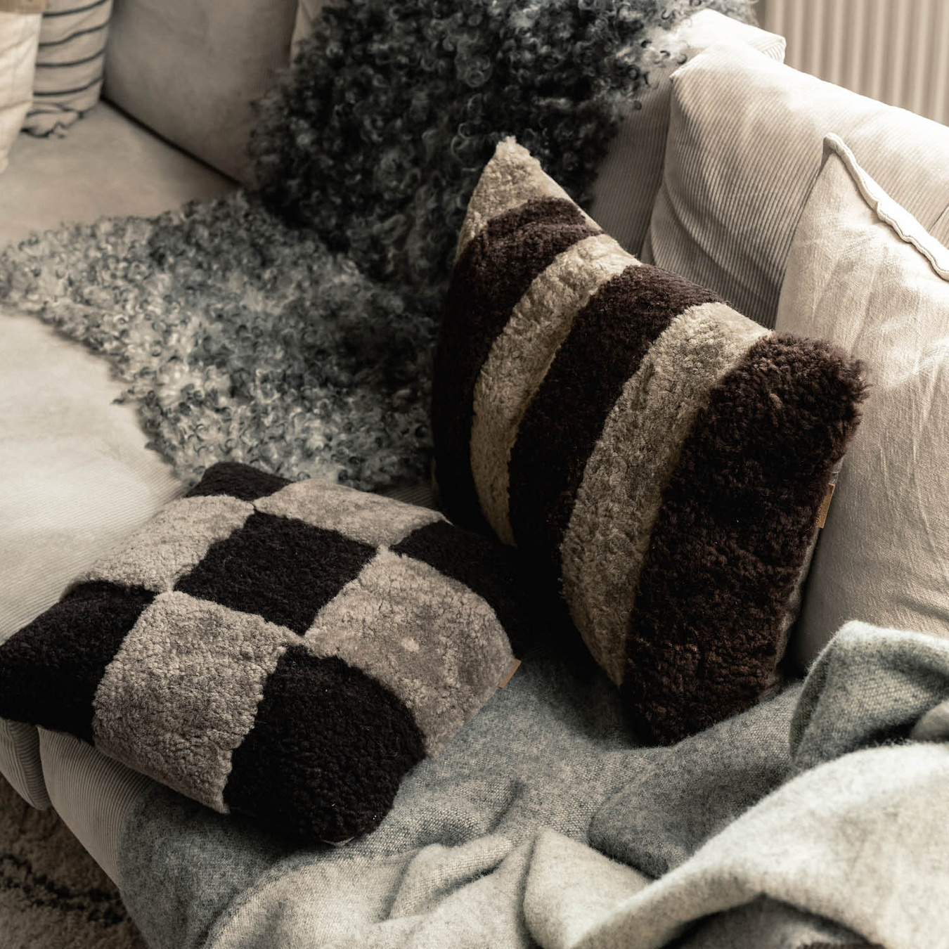 Shepherd Ruth. A checkered cushion in sheepskin. The back made of weaved wool. Hidden zip. 40x40cm, 15,7x15,7 inches